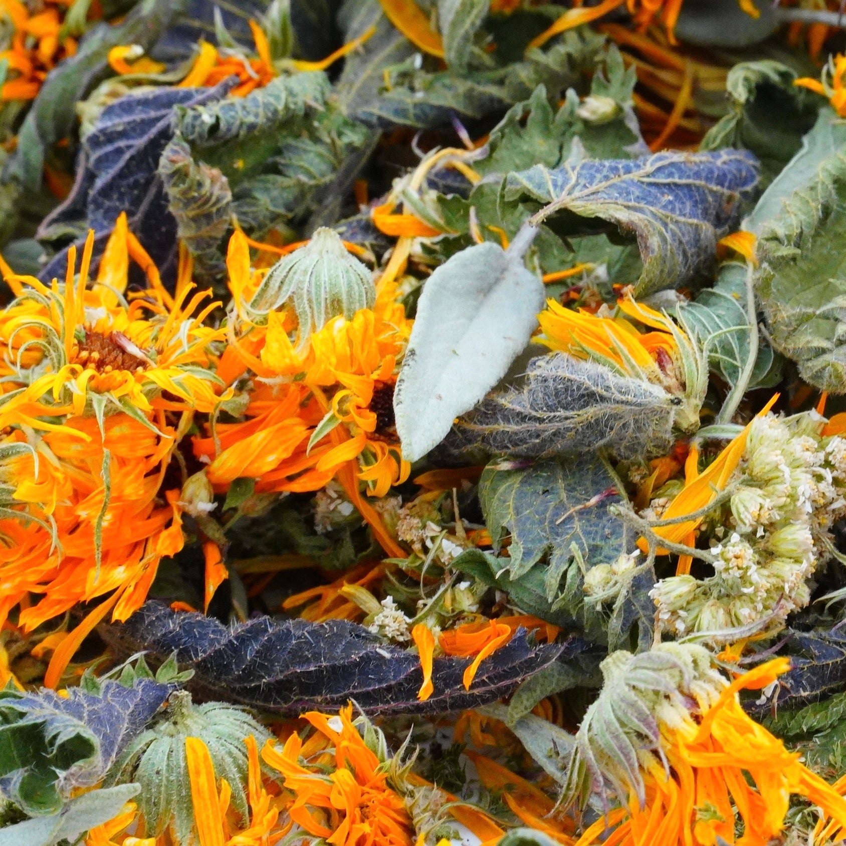 Le thym citronné apporte une note fraîche et une touche vive. La sauge, aux arômes profonds, structure le mélange avec une présence chaleureuse. L’achillée millefeuille, fine et herbacée, évoque les prairies d’été. Le bleuet, avec ses pétales bleus intenses, ajoute une douceur visuelle et florale. Le souci, aux teintes dorées, complète l’ensemble par ses notes végétales enveloppantes.
